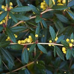 Вечнозелёный кустарник 0,5—2 м (в ареале до 3—4 м) высоты, выпрямленной формы с очень плотной, густоветвистой почти шаровидной кроной. Ветви пр ленной формы с очень плотной, густоветвистой почти шаровидной кроной. Ветви прямостоячие, серовато-желтые, с возрастом ветви дугообразно свисают вниз. Побеги желтоватые, ребристые, в молодости не опушённые. Колючки 1—3 см длины, трехраздельные, мощные, жесткие. Листья простые, цельные 3—10 см длины, около 2,5 см ширины, овально-ланцетные или обратнояйцевидно-ланцетные, тупые или коротко заостренные, густопильчатые, с 12—20 мелкими, шиповато-колючими зубцами с каждой стороны, голые, жесткие, кожистые, сверху темно-зеленые, глянцево-лоснящиеся, снизу палевые и слабо блестящие. Корневая система состоит из мощного слаборазветвленного и широко распростёртого основного корня. Цветки 1 см диаметром, желтые, снаружи иногда красноватые, собранные в малоцветковые пучки. Цветоножки до 1,5 см длины. Цветет в июне. Плоды 0,8—0,9 см длины, продолговатые, сине-черные, с плотным белым восковым налетом, с коротким столбиком.