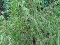 Хвойное дерево, около 18-20, единично до 30 м, с прямым стволом до 1-2 м в диаметре, покрытым гладкой коричневой корой. Ветви повислые очень характерной формы: ветви первого порядка горизонтальные или восходящие, они в свою очередь по все длинне снабжены вертикально свисающими сильно уплощенными, тонкими около 1 мм толщины побегами второго порядка, расположеными в одной плоскости в двух противоположных рядах - отсюда выраженная плакучесть, отраженная в латинском видовом эпитете.
