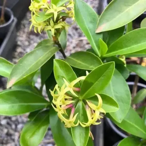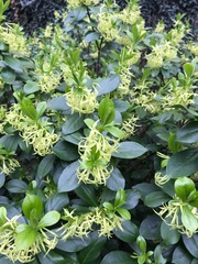 Вечнозеленый кустарник 1-1,5 м высотой и шириной с овальными, остроконечными, блестящими, темно-зелеными листьями, до 10 см длиной. Цветет в начале лета. Цветки - желто-зеленые, ароматные, до 2 см в диаметре, собраны по 2-3 в пазушные кистевидные соцветия. Плоды - сочные черные ягоды. Этот кустарник вполне устойчив в Средней полосе России, в Санкт-Петербурге не зимостоек, но в 4-5 климате растет довольно медленно. За пределами 5 климатической зоны цветет нерегулярно, плоды завязывает редко.